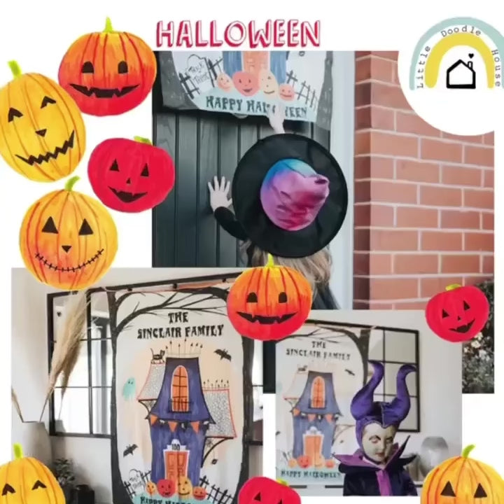 Add your family name, house number and choose how many large or small pumpkins you would like to represent your family members on this uniquely personalised banner decoration.