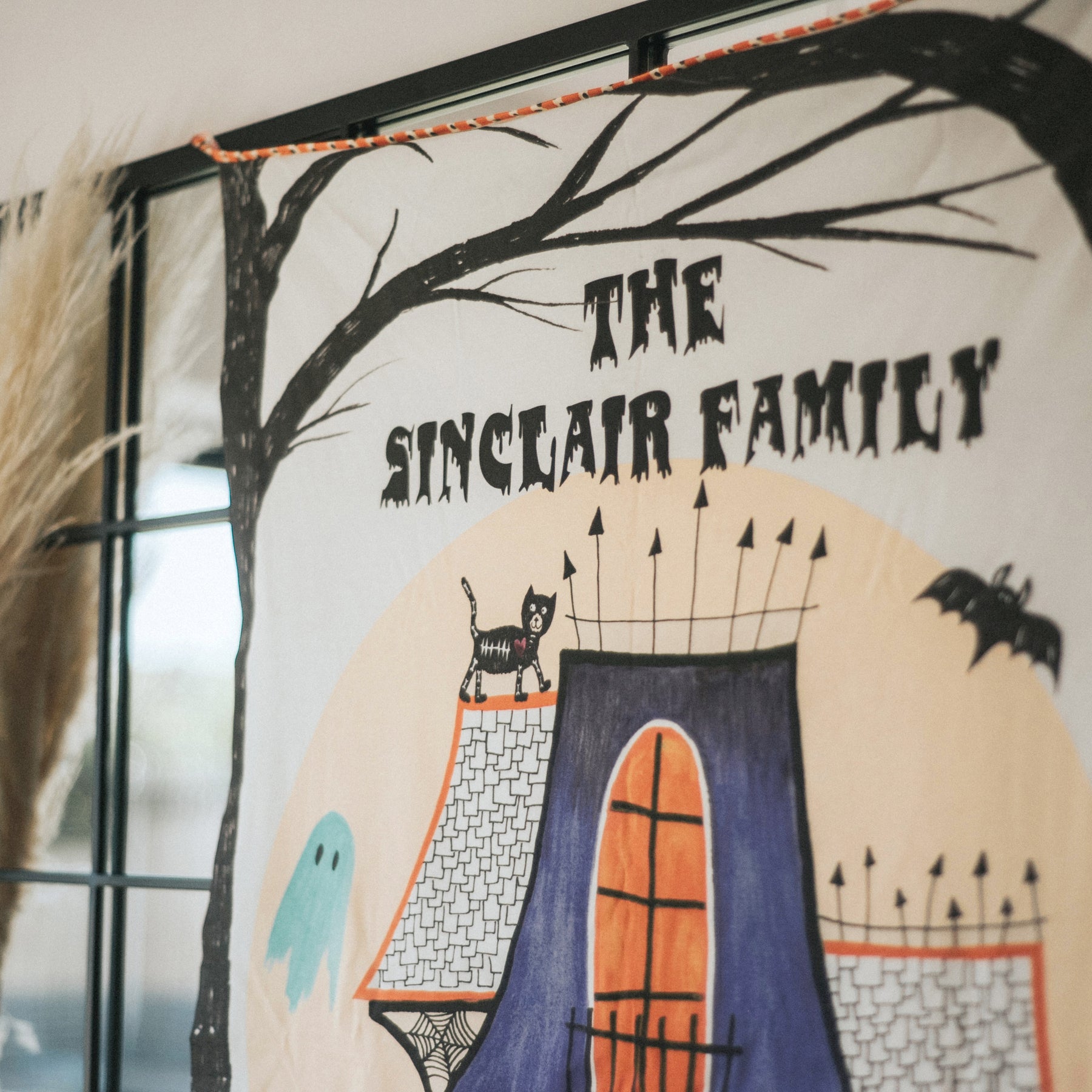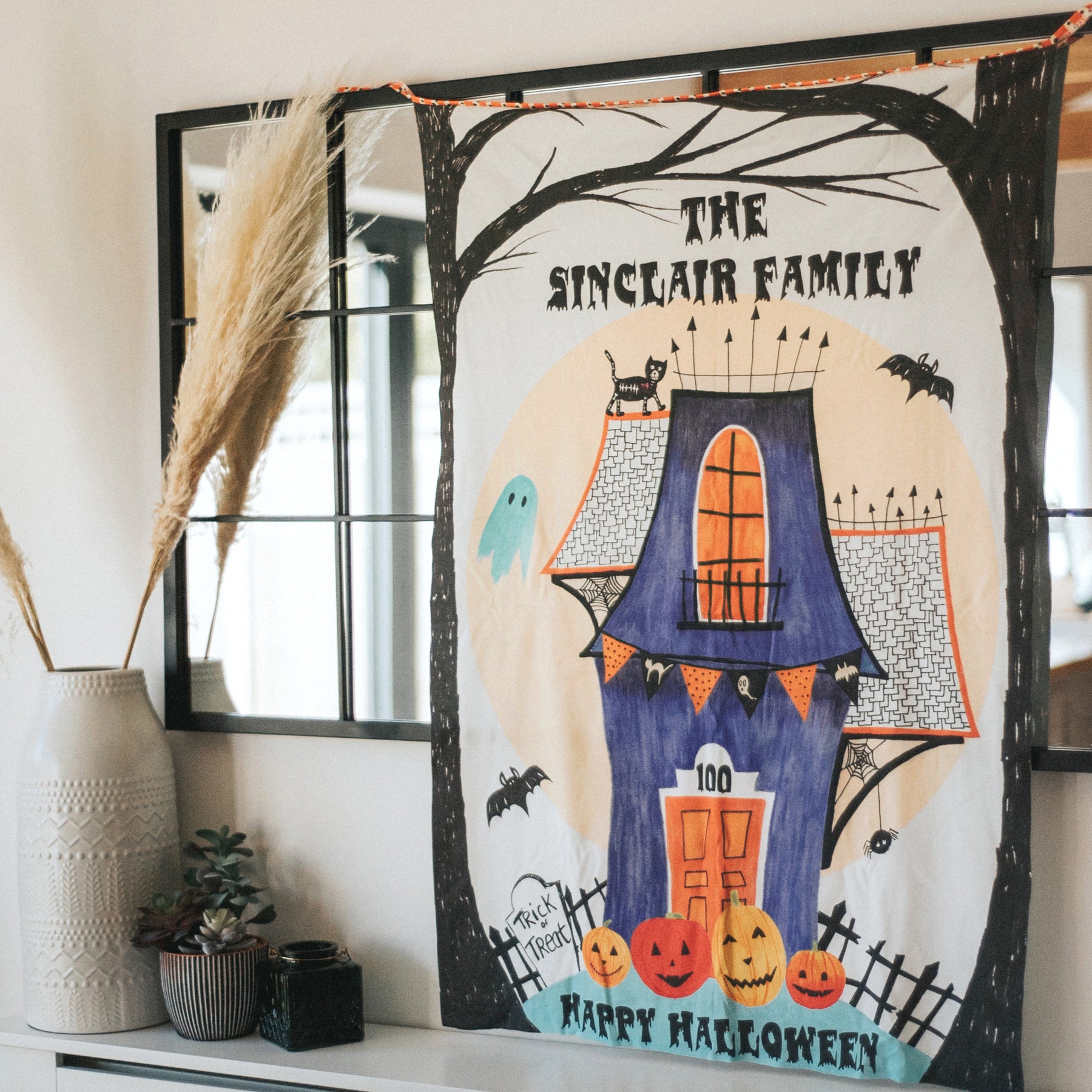 Make Halloween special this year and create a spooky atmosphere at home with this personalised haunted house organic cotton banner